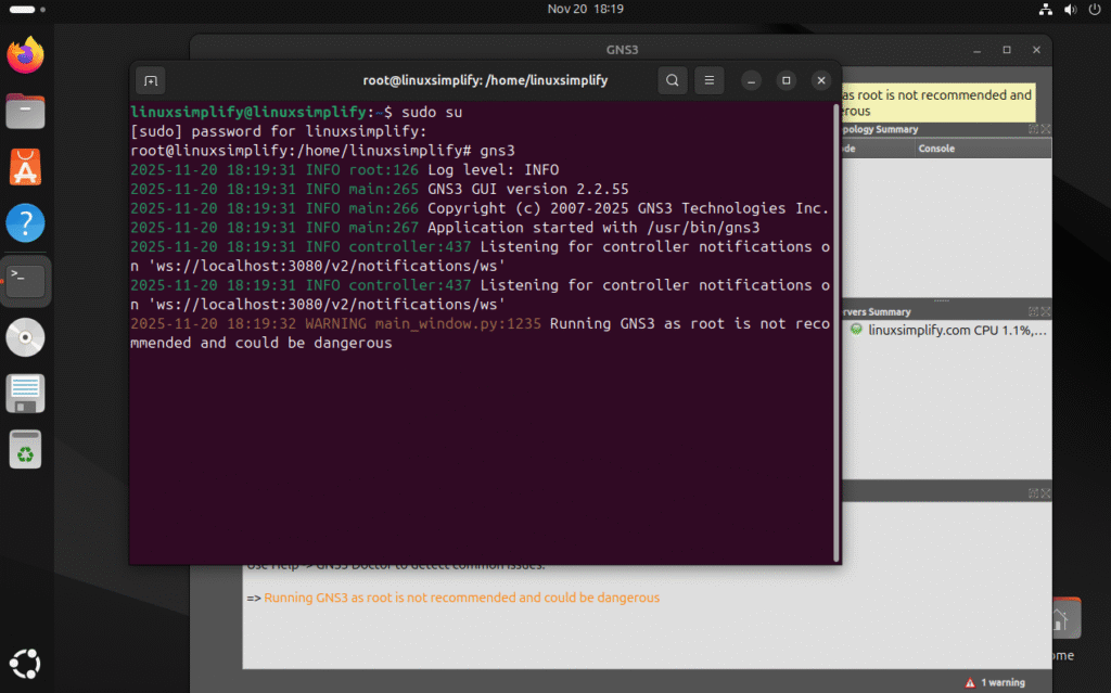 - Melalui terminal: Kamu juga bisa menjalankannya langsung lewat terminal dengan perintah: gns3