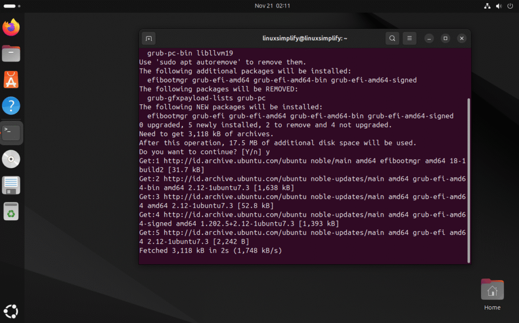 sudo grub-mkconfig -o /boot/grub/grub.cfgJika tidak muncul error, berarti proses pemasangan ulang GRUB berjalan dengan baik.