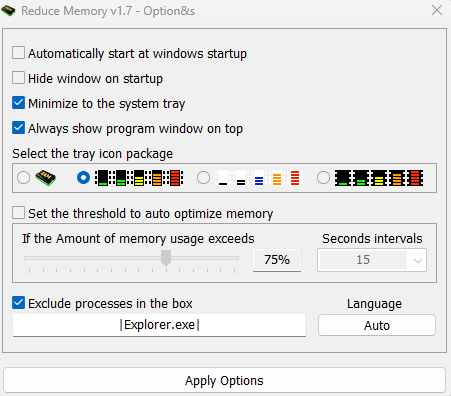Tombol Clear Memory adalah fitur paling gampang. Sekali klik, terlihat berapa banyak RAM yang berhasil dibebaskan. Kalau mau lebih detail, bisa buka menu Options dan atur: